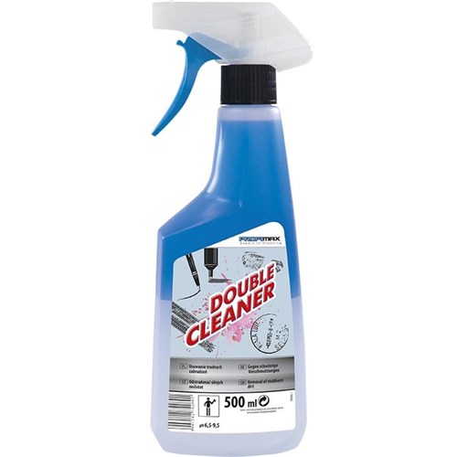 DOUBLE CEANER to dwufazowy środek do usuwania trudnych i uporczywych zabrudzeń. Faza błękitna rozpuszcza zabrudzenia, doskonale czyści oraz przeciwdziała powstawaniu smug. Faza transparentna chroni wyczyszczone powierzchnie i zapobiega ponownemu zabrudzeniu. Skutecznie usuwa tłuszcz, lepki brud i smary, usuwa naklejki, atrament, markery, z takich powierzchni jak: tworzywa sztuczne (np. ramy okienne, plastikowe meble ogrodowe), ceramika, kafelki, powierzchnie emaliowane i szklane, linoleum, metalu. Produkt gotowy do użycia.