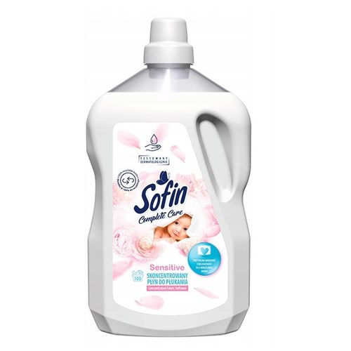 Skoncentrowany płyn do płukania tkanin Sofin Complete Care Sensitive, który dba o kolory i tkaniny Twoich ubrań.