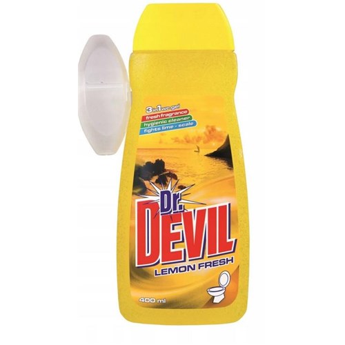 Żel do WC marki Dr Devil pachnie, czyści i zapobiega osadzaniu się kamienia wodnego. Do produktu dołączony jest koszyczek, który może zostać uzupełniany żelem.