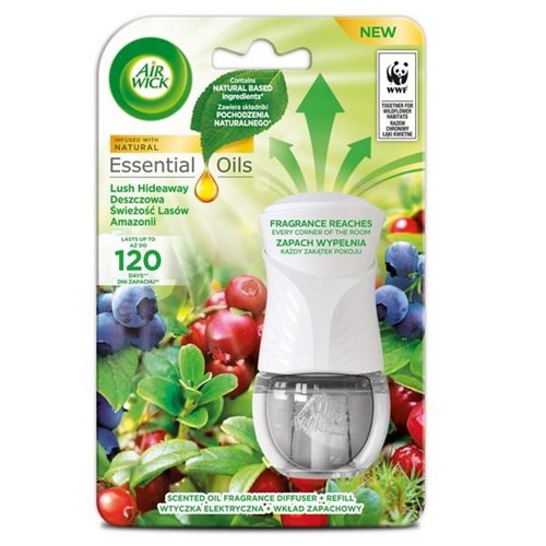 amień swój dom w odosobnione miejsce ukryte wśród bujnej, leśnej zieleni dzięki aromatom jeżyny, zroszonych liści i rozmarynu. Elektryczny odświeżacz powietrza Air Wick skutecznie eliminuje nieprzyjemne zapachy i działa nawet przez 75 dni*. Intensywność zapachu ma aż 5 poziomów, które możesz dowolnie zmieniać przez cały czas działania urządzenia.