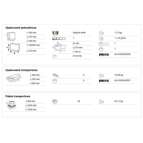 biały 1 warstwowy , gramatura 45g/m2,średnica tulejki 42 mm,długośc 180mb,wymiary rolki x 190 mm,y 210 mm,z 190 mm