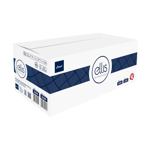 Celulozowy, dwuwarstwowy i klejony ręcznik składany wielopanelowy do użytku profesjonalnego w pomieszczeniach o zwiększonym natężeniu użytkowania. Ręcznik składany typu Z (trzypanelowy)