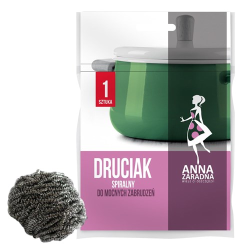 Do czyszczenia mocno zabrudzonych garnków i patelni wykonanych z aluminium, stali, stali emaliowanej lub żaroodpornego szkła użyj Druciaka spiralnego Anna Zaradna. Innowacyjna formuła wykonania metalowego druciaka sprawia, że nie rysuje czyszczonych powierzchni i nie rani dłoni. Druciak spiralny zbudowany jest ze zwiniętej spiralki charakteryzującej się giętkością i sprężystością. Druciak spiralny sprawdza się idealnie przy bardzo trudnych zabrudzeniach, np. przypalonym i zaschniętym jedzeniu.